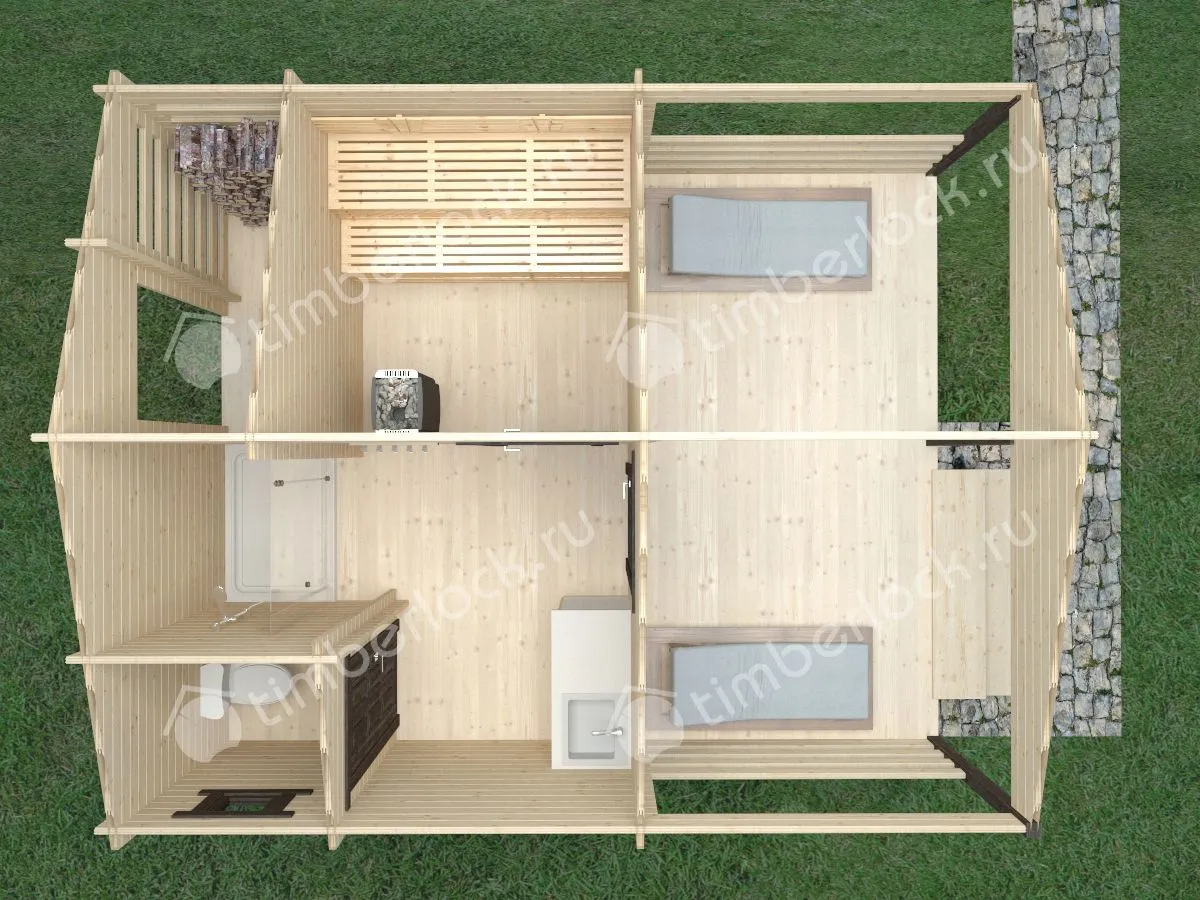 Оптимальный вариант средней садовой бани. При относительно небольших размерах в этой планировке вместилась парилка 2х2м, душевая комната, комната отдыха и предбанник с туалетом. Дровяная печь с панорамным стеклом придаст уют и комфорт вашему отдыху. Отличный вариант для 4-7 человек.