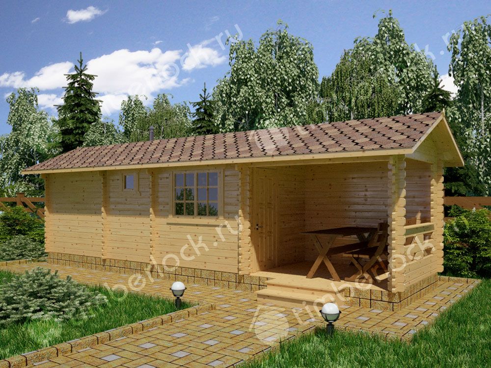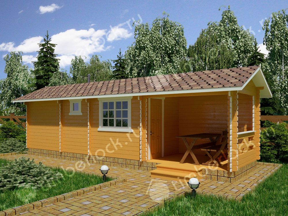Вытянутая деревянная дачная баня из мини бруса с верандой под навесом и помывочной.