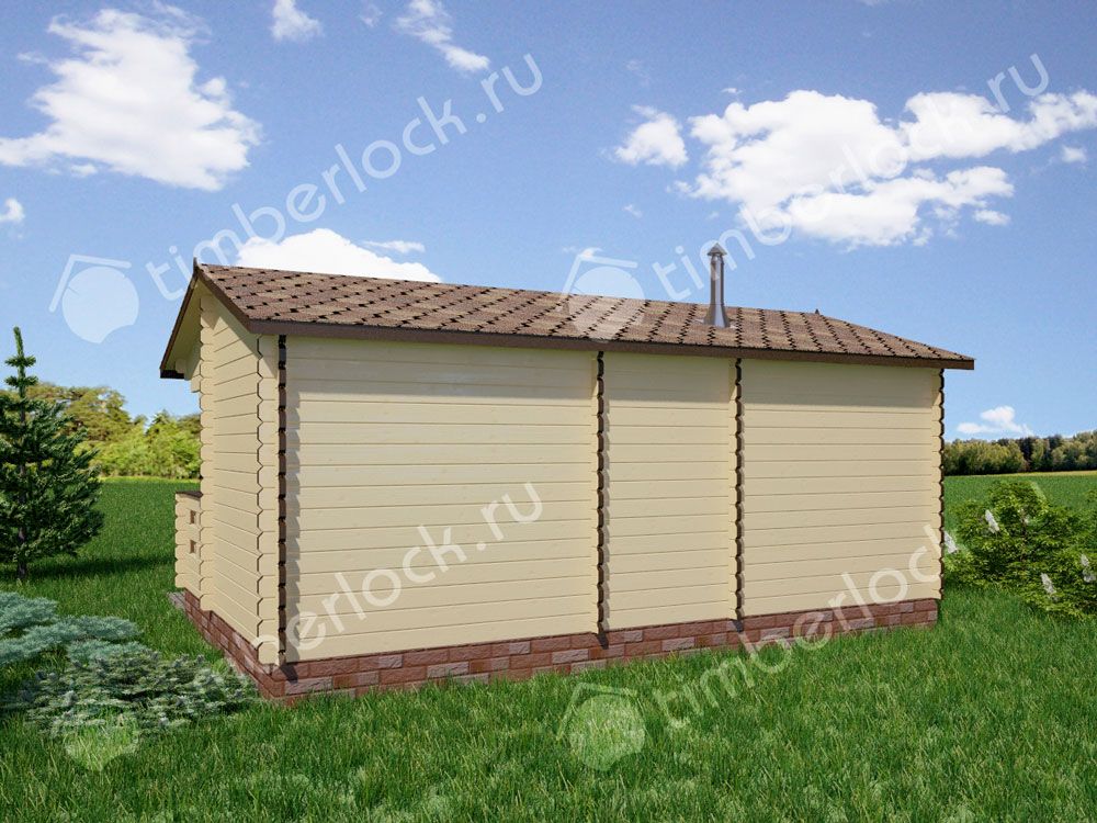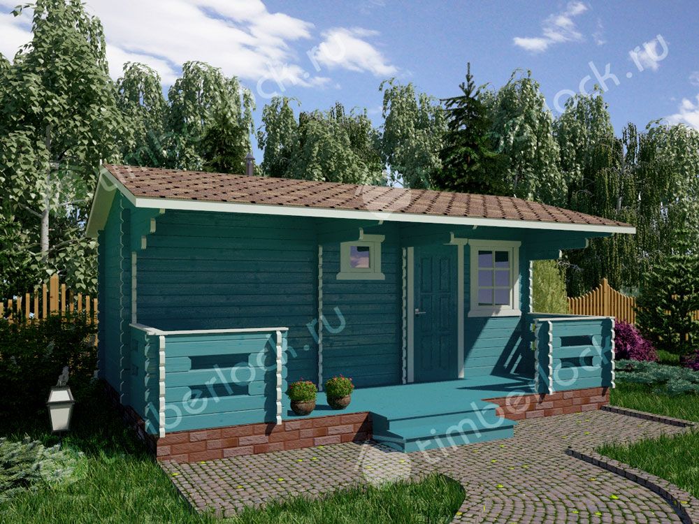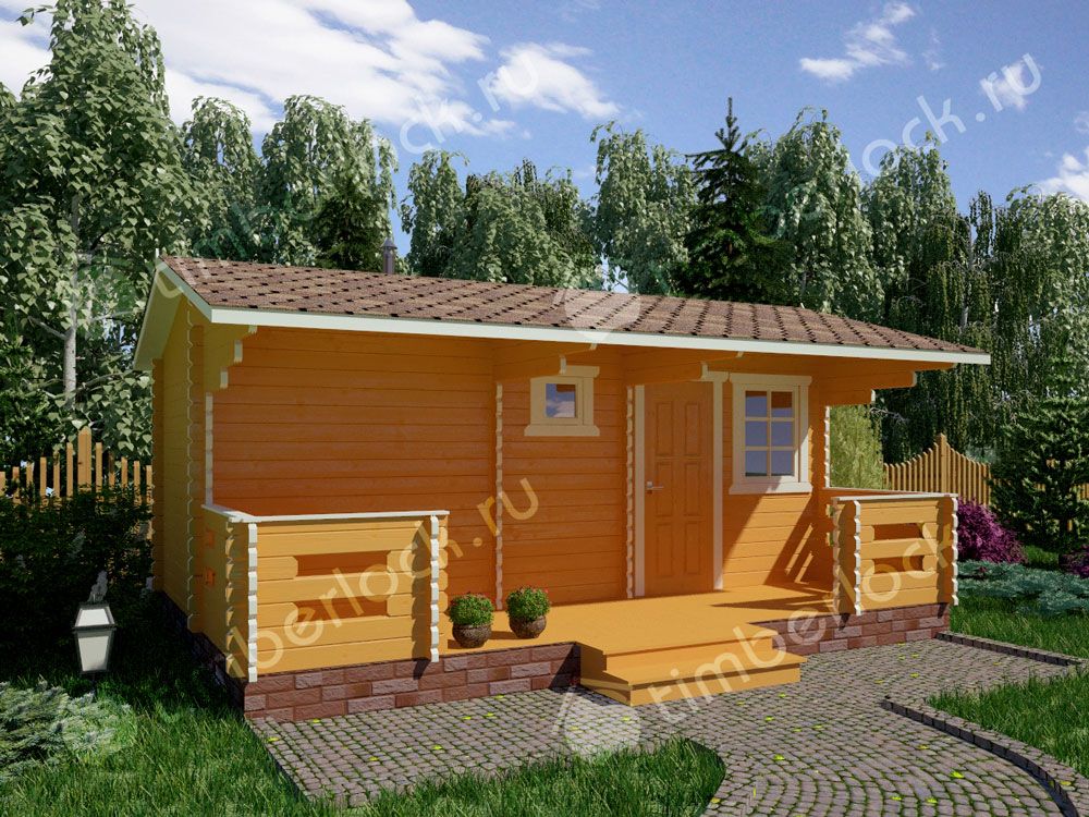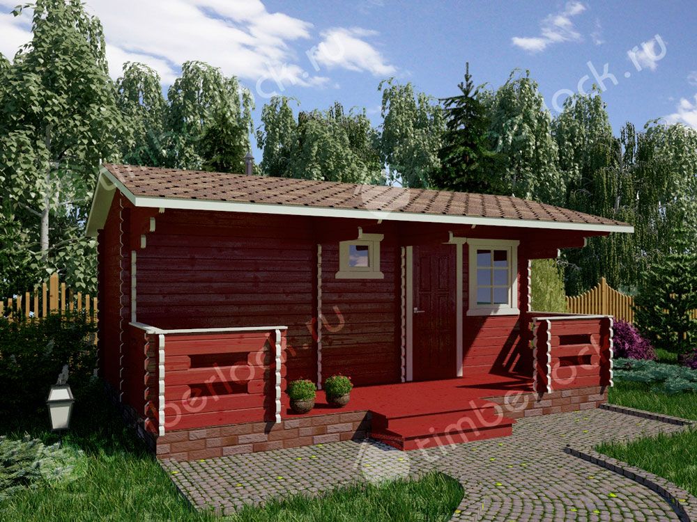 Уютная садовая баня из мини бруса с небольшой верандой под навесом.
