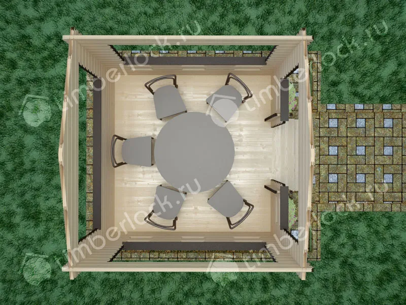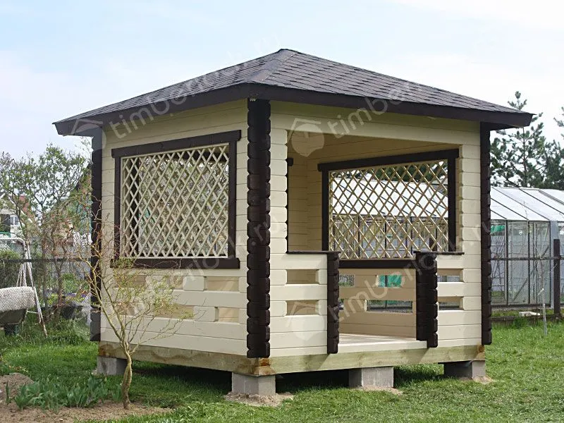Универсальный вариант садовой беседки с крышей на четыре ската. Проектом предусмотрено помещение площадью 7.3м2 при общих размерах беседки 3х3м.