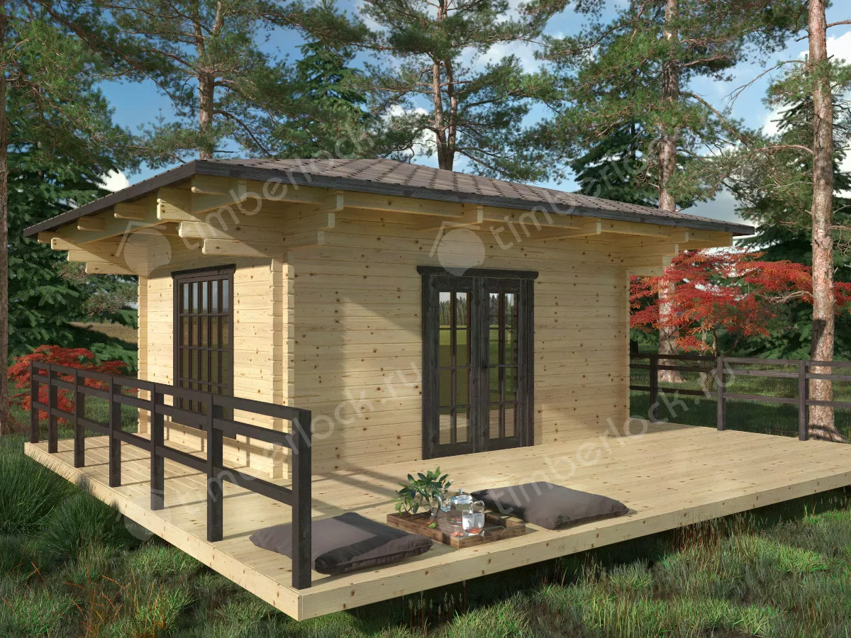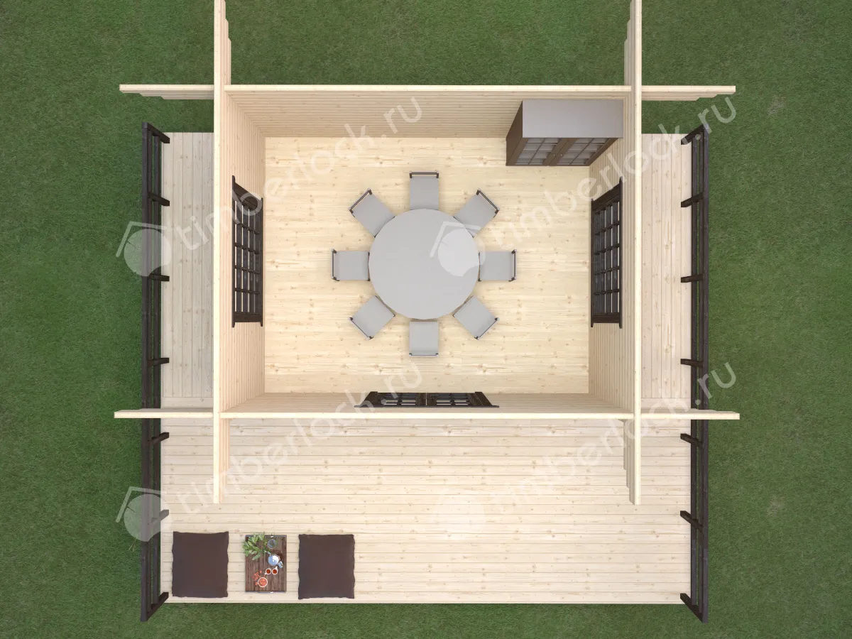 Отличный вариант теплой беседки в японском стиле с витражным окном и с большой террасой. При размерах 4х5м и площади комнаты 17.5м2 эта беседка является отличным вариантом для отдыха большой компании на природе.