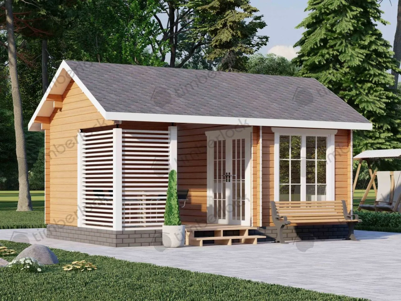 Современная беседка разделена на 2 части. На веранде можно разместиться дружной компанией, а в закрытой части организовать летнюю кухню и разместить гостей. Может использоваться также как летний садовый домик и станет отличным местом для отдыха на Вашем дачном участке в любую погоду.