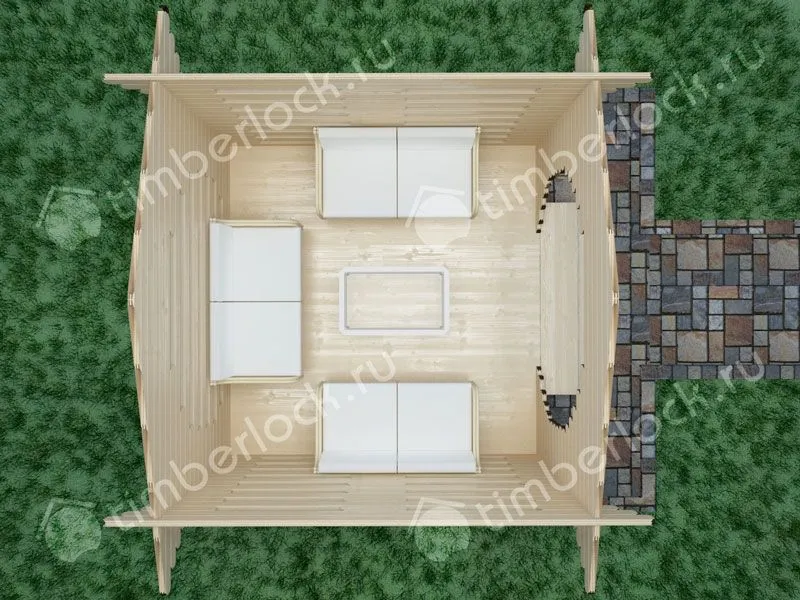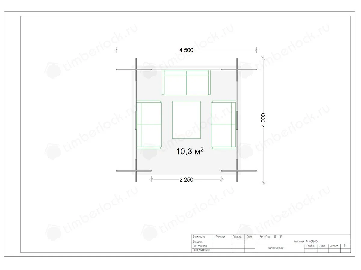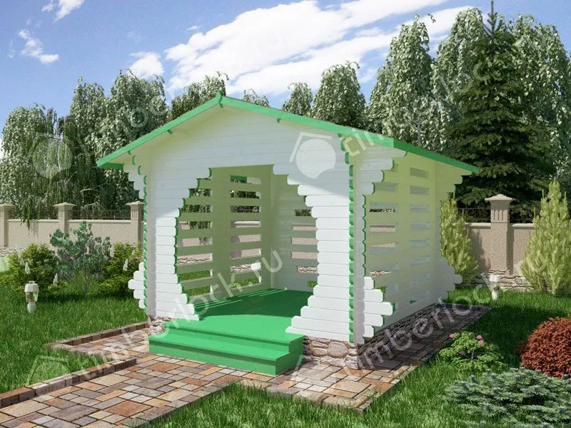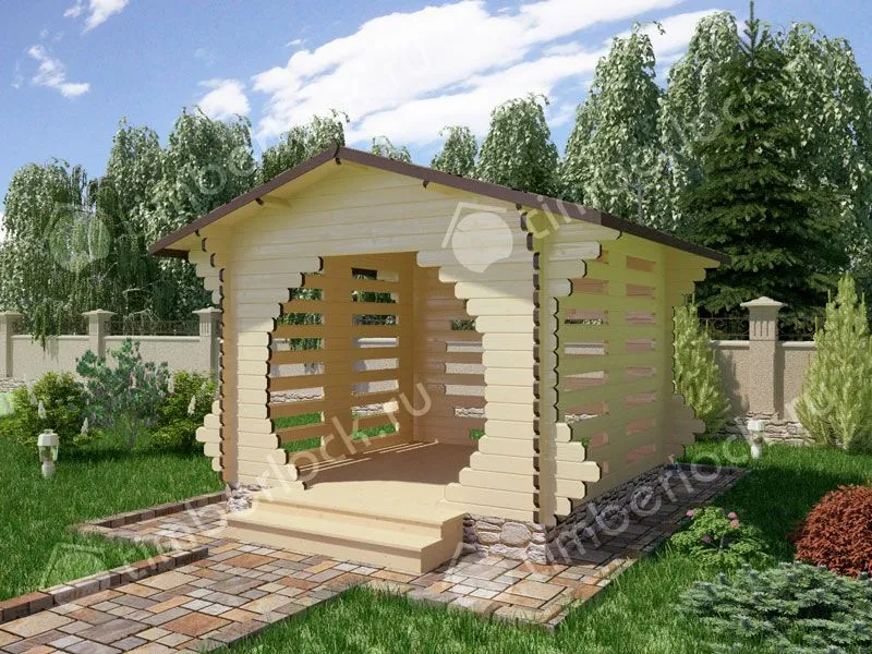 Интересный вариант нестандартной беседки для загородного дома или детского сада. Полезная площадь составляет 10.3м2 при размерах 4.5х4м.