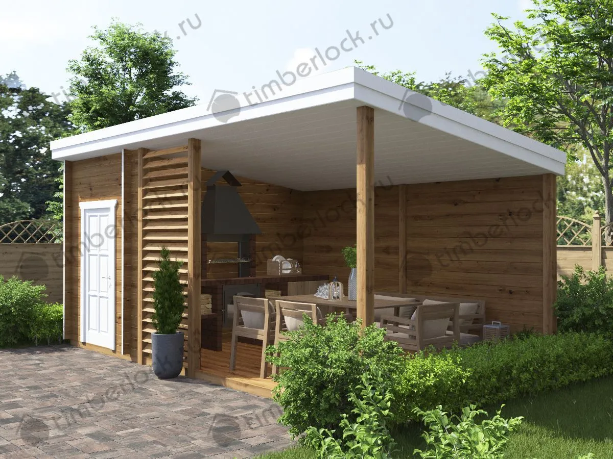 Просторная открытая беседка является отличным местом для отдыха большой дружной компании, а вместительный хозблок позволяет убрать на зимнее время мебель с открытой части беседки, а также хранить садовый инвентарь. Площадь беседки позволяет зонировать на полноценную зону барбекю и место для отдыха за столом.