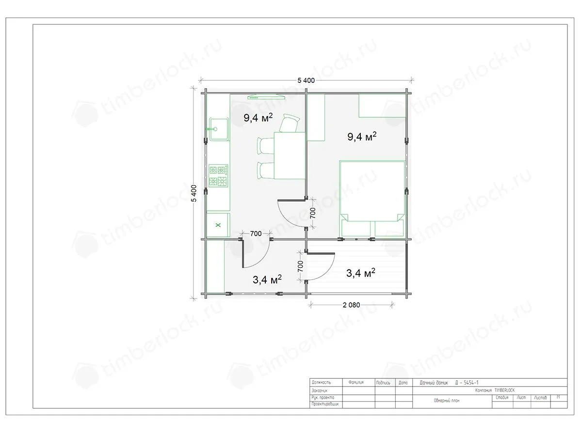 Эргономичный проект дачного домика с небольшой прихожей и двумя жилыми комнатами по 9.4м2.