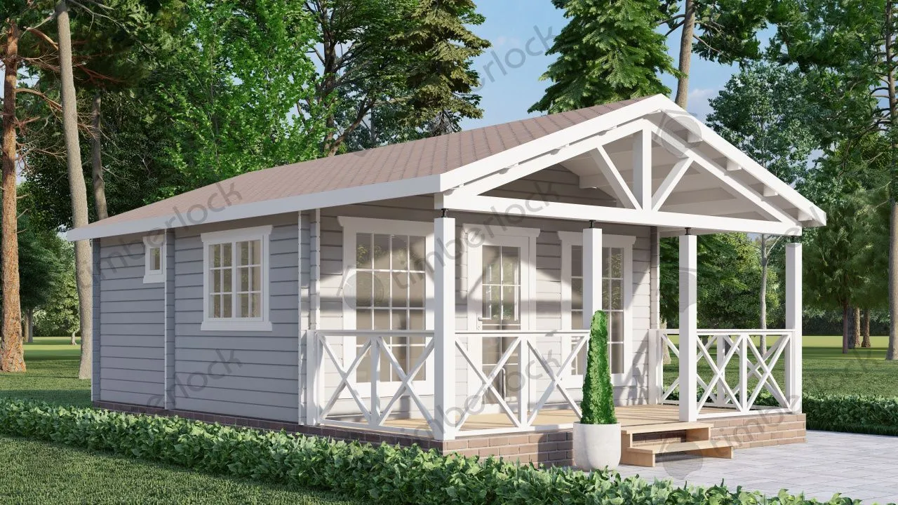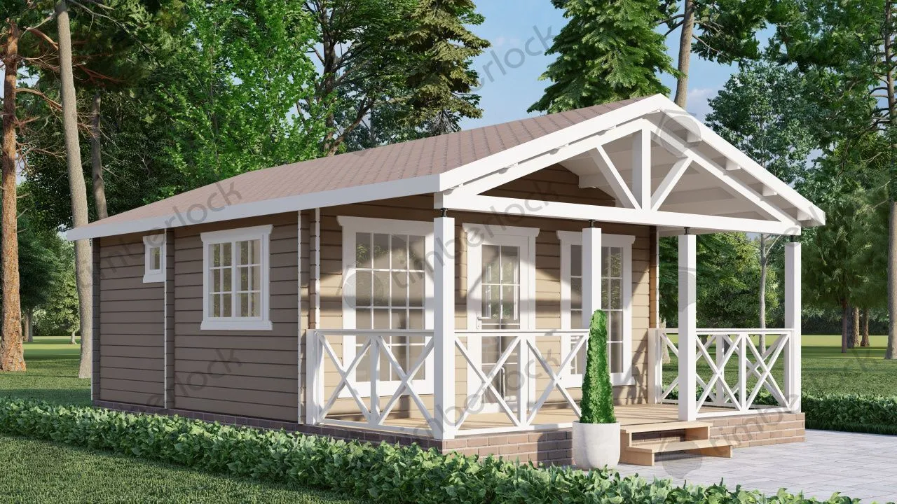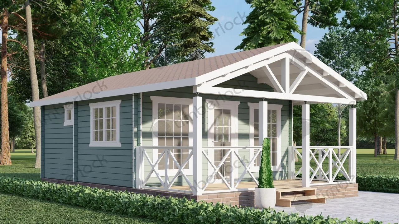 Проект дачного домика с одной спальней, зоной кухни и санузлом. Такая планировка позволяет использовать дом как гостевой и для небольшой семье до 3-х человек.