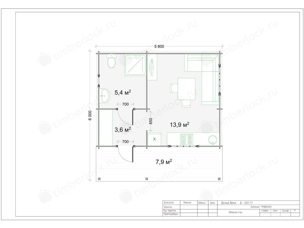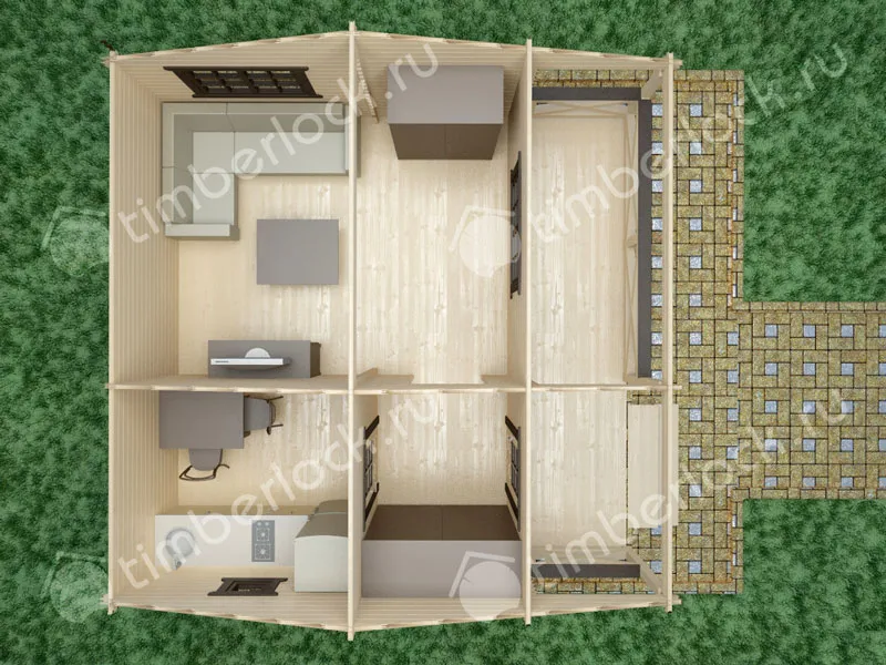 Дачный домик правильной квадратной формы с террасой и тремя помещениями.