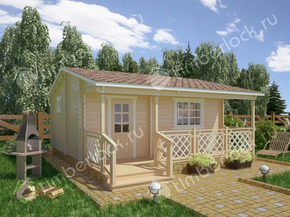 Дачный домик средней площади с зонированием внутренних помещений и верандой под навесом.