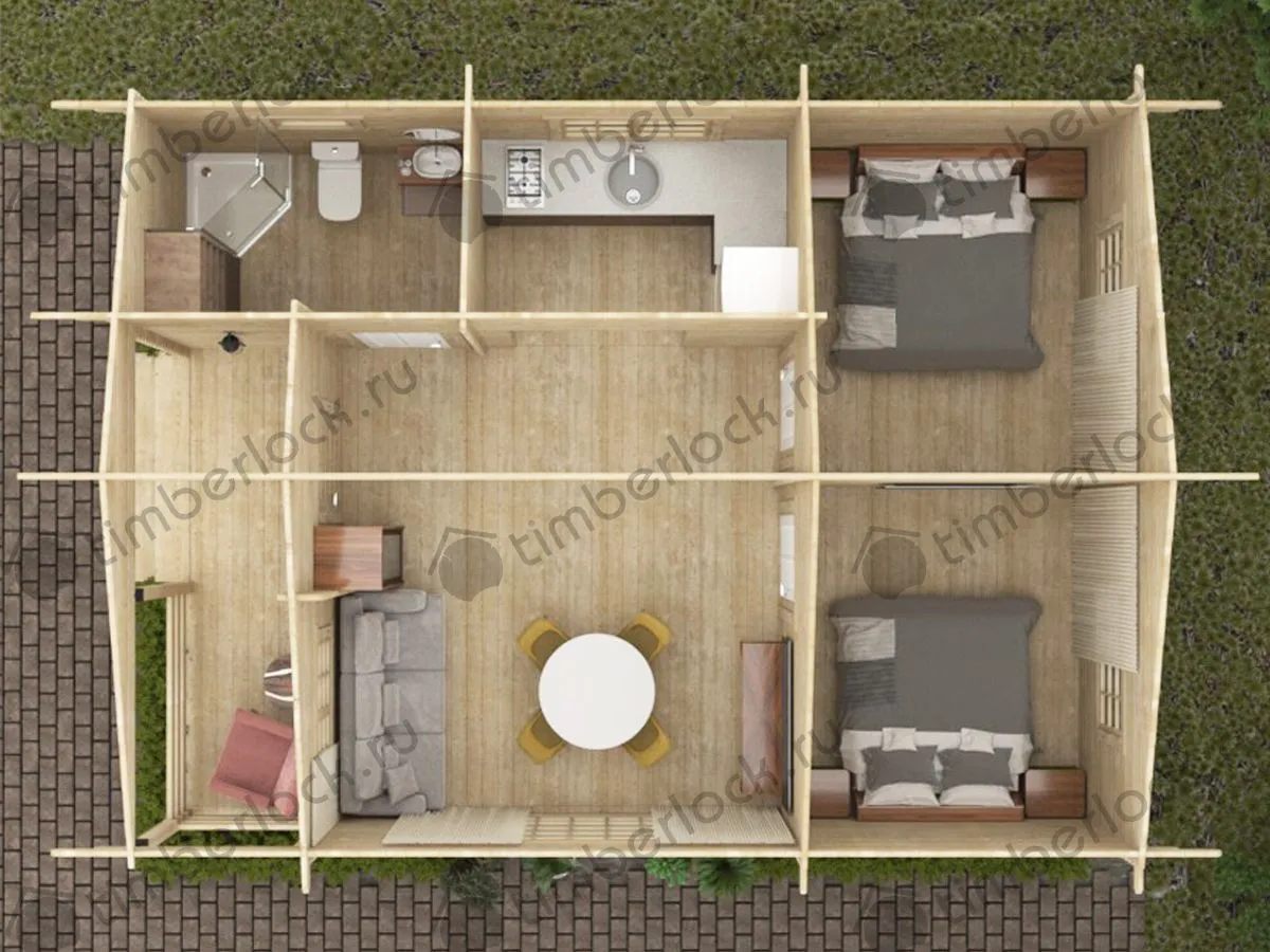 Проект дачного домика с тремя комнатами: гостиная и две спальни. Такая планировка позволяет комфортно разместиться всей семье .