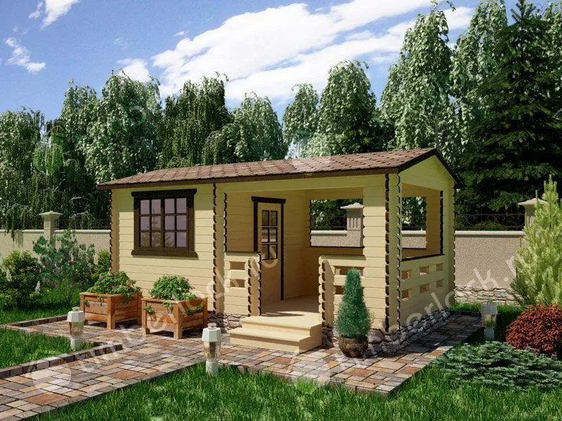 Одноэтажный садовый домик из минибруса, разделенный на 2 блока.