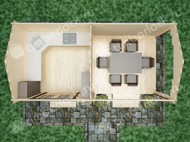 Двухсекционный садовый домик с открытой и закрытой зоной. Закрытое помещение можно использовать как комнату отдыха или летнюю кухню, открытую зону - как место для хранения инвентаря или веранда.