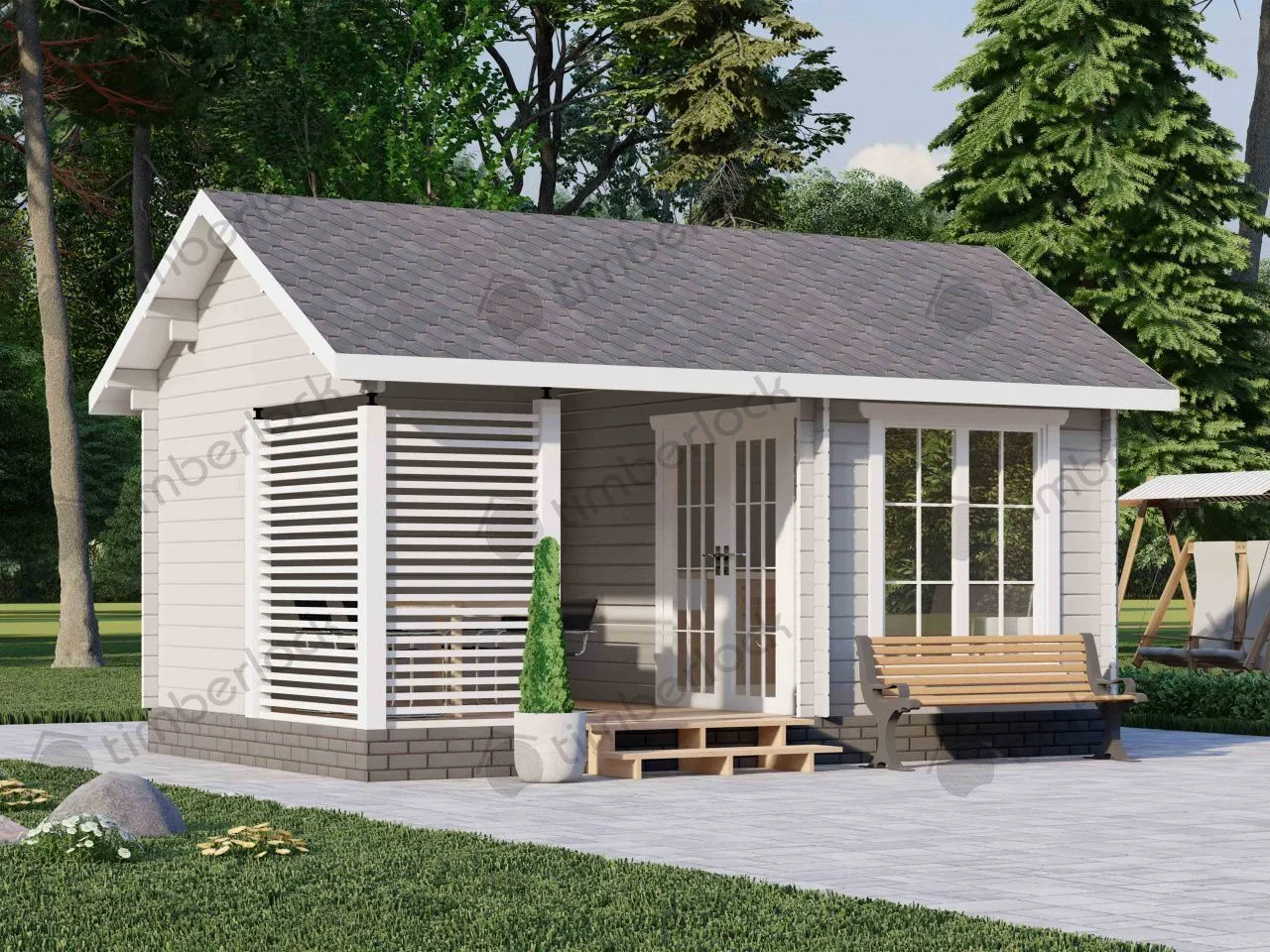 Садовый домик средних размеров с верандой - прекрасное решение для небольшого дачного участка. Можно использовать для временного проживания в тёплое время года, как летнюю кухню или как гостевой домик.