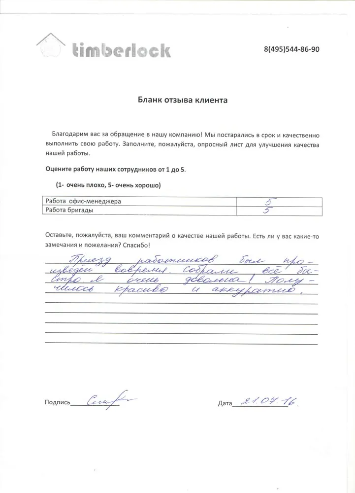 Прекрасная работа коллектива компании Тимберлок! Все детали прорабатываются и согласовываются с заказчиком. И, конечно же, присутствует высочайший класс исполнения утверждённого проекта. Нас также устроило оптимальное, на наш взгляд, соотношение цена-качество. Сумма фиксируется в договоре и никаких дополнительных платежей! Очень довольны покупкой! Процветания компании Тимберлок!