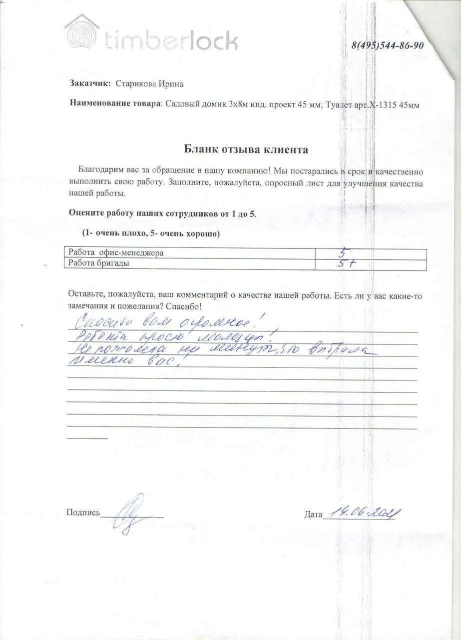Хочу выразить огромную благодарность компании "Тимберлок", за быстрое, качественное, профессиональное строительство моего красивого хозблока (под ключ). Рабочая команда слажена, замечательные ребята, знающие свое дело. Выполнили за 1 день, точно в срок! А также благодарность их руководству. Мне очень все понравилось. Рекомендую!!!