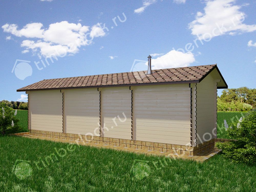 Вытянутая деревянная дачная баня из мини бруса с верандой под навесом и помывочной.