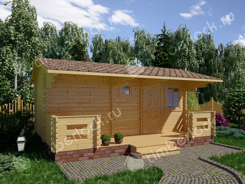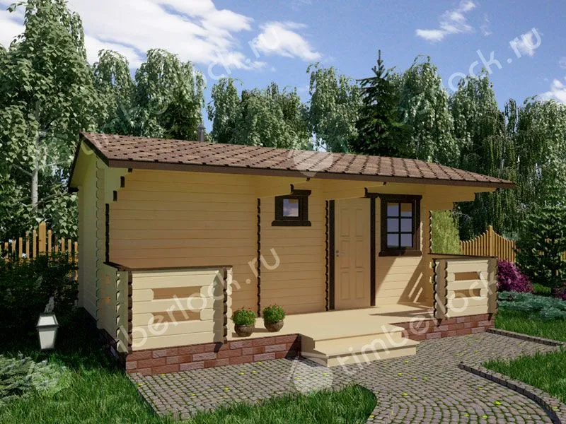 Уютная садовая баня из мини бруса с небольшой верандой под навесом.