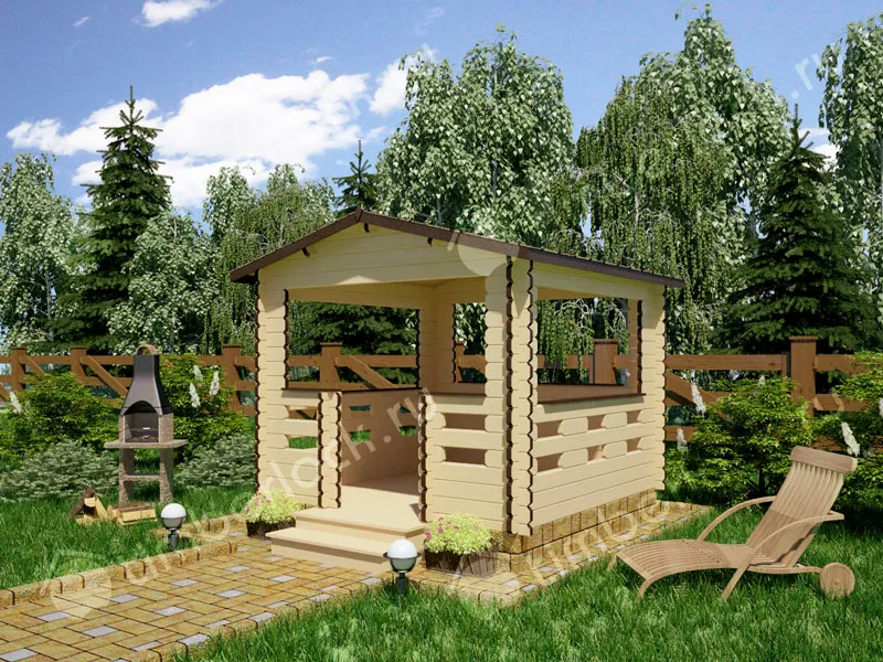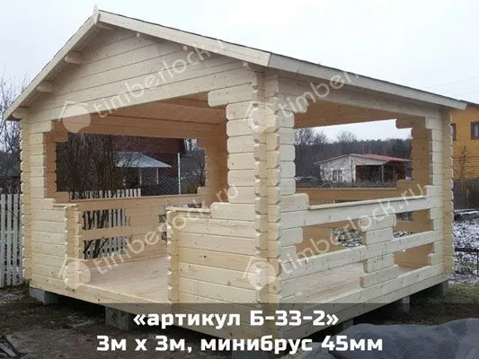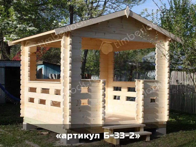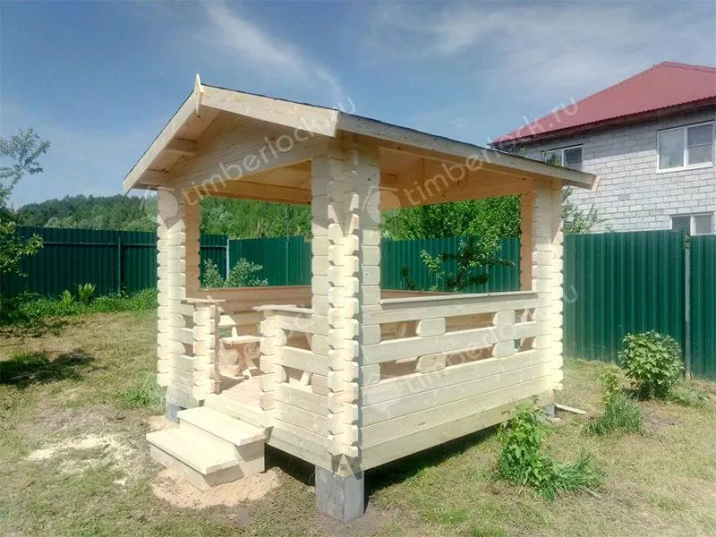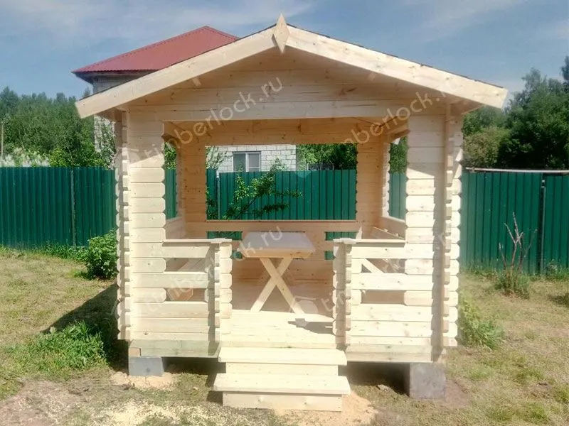 При изготовлении беседки используется профилированный брус камерной сушки. Благодаря этому не требуется усадка и беседка готова к эксплуатации сразу после окончания строительства.