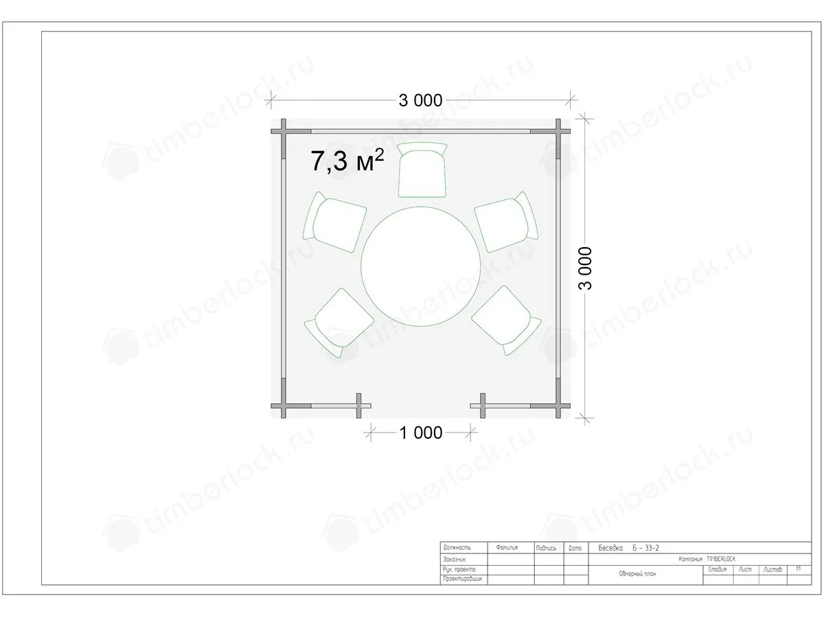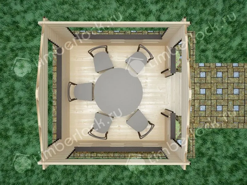 Садовая открытая беседка 3х3 подойдёт для отдыха в жаркий летний день. Полезная площадь составляет 7.3м2 при общих размерах беседки 3х3м. В беседке поместится стол и стулья. Можно разместиться компанией до 6 человек. Отлично впишется на небольшом садовом участке благодаря своим небольшим размерам.