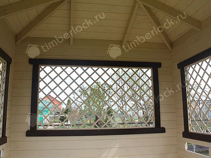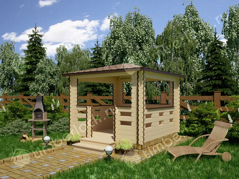 Универсальный вариант садовой беседки с крышей на четыре ската. Проектом предусмотрено помещение площадью 7.3м2 при общих размерах беседки 3х3м.