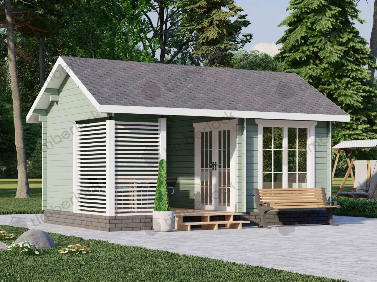 Современная беседка разделена на 2 части. На веранде можно разместиться дружной компанией, а в закрытой части организовать летнюю кухню и разместить гостей. Может использоваться также как летний садовый домик и станет отличным местом для отдыха на Вашем дачном участке в любую погоду.