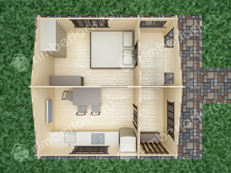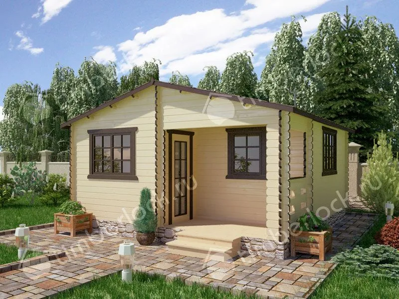 Эргономичный проект дачного домика с небольшой прихожей и двумя жилыми комнатами по 9.4м2.