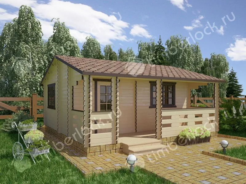 Эргономичный дачный домик для отдыха на садовом участке. Домик имеет правильную квадратную форму и удобную планировку.