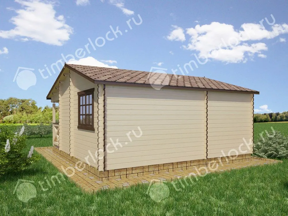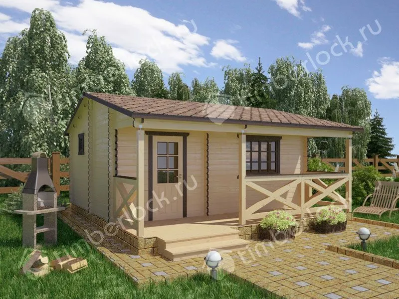 Универсальный дачный домик правильной квадратной формы с крытой террасой и тремя внутренними помещениями.
