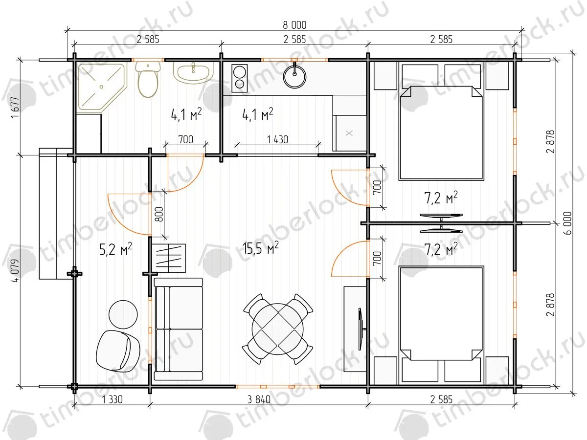 Проект дачного домика с тремя комнатами: гостиная и две спальни. Такая планировка позволяет комфортно разместиться всей семье .
