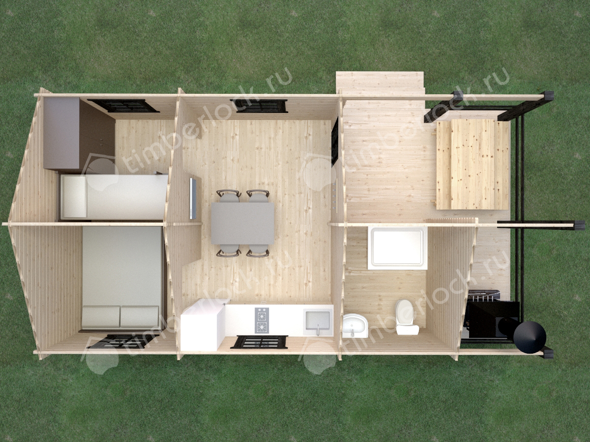 Одна из интересных новинок среди наших проектов. Благодаря продуманной планировке и наличию веранды этот проект популярен среди проектов кемпинговых домиков.