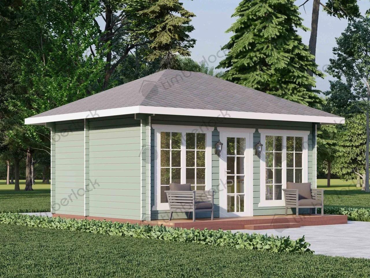 Красивый садовый домик с 4-скатной крышей прекрасно впишется на любом дачном участке. Компактные размеры и интересная архитектура позволяет построить домик эконом класса за короткий срок - 1-2 дня. Его можно использовать, чтобы разместиться небольшой семьёй,а также как гостевой домик или беседку.