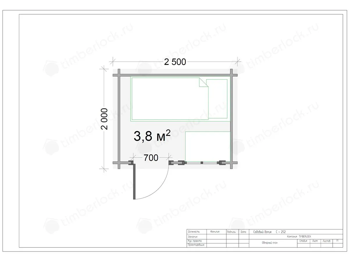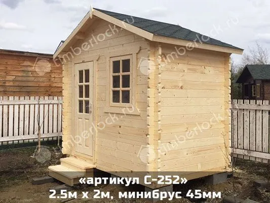 Маленький садовый домик для отдыха или хранения садового инвентаря - отличное решение для тех, кому не нужна большая постройка на территории. Проектом предусмотрено одно помещение общей площадью 3.8 м2 при габаритных размерах домика 2.5м на 2м. Дверь и полноразмерное окно располагается на переднем фасаде.