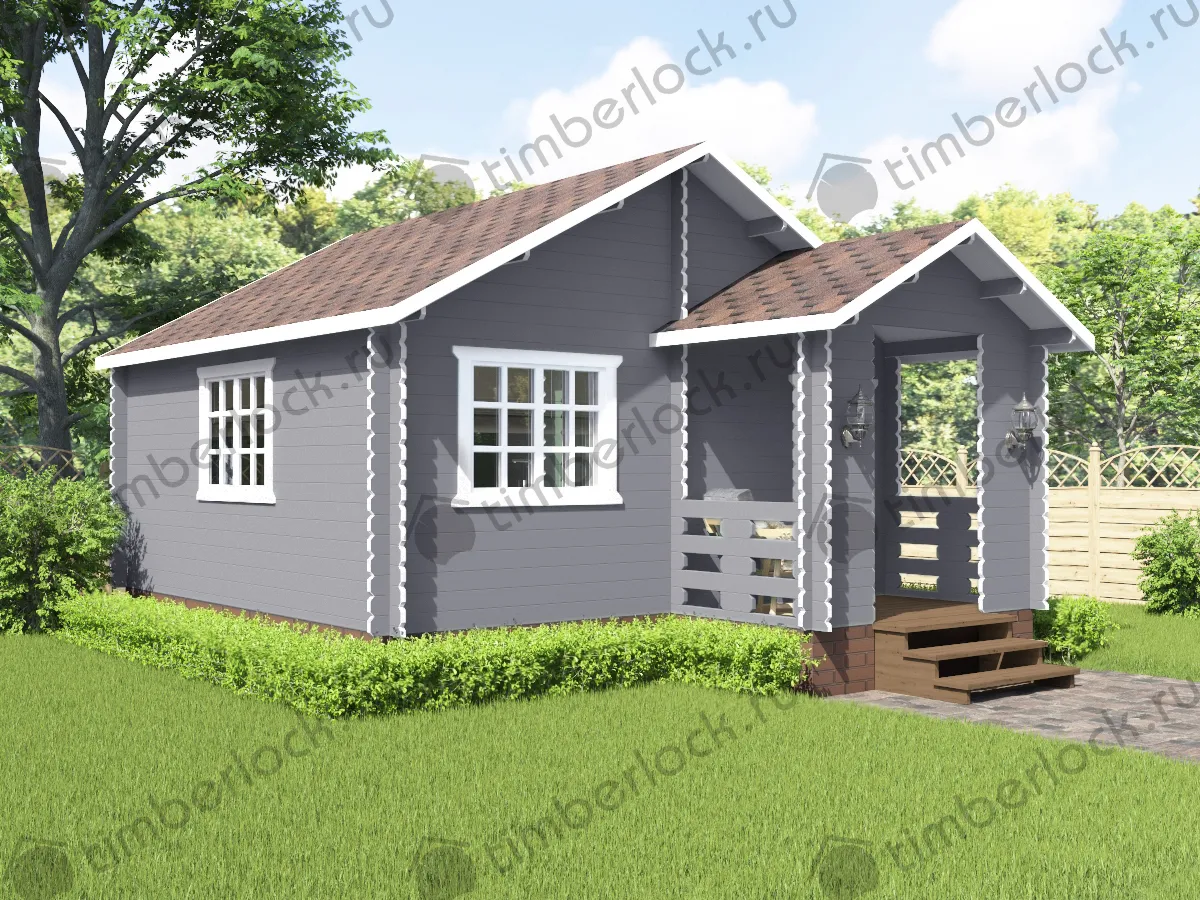 Садовый домик средних размеров с крыльцом - отличное решение для небольшого дачного участка. Можно использовать для временного проживания в тёплое время года или как гостевой домик.