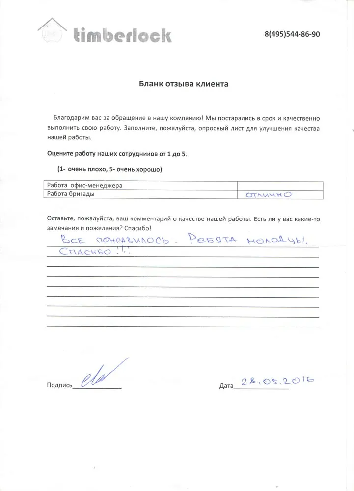 Прекрасная работа коллектива компании Тимберлок! Все детали прорабатываются и согласовываются с заказчиком. И, конечно же, присутствует высочайший класс исполнения утверждённого проекта. Нас также устроило оптимальное, на наш взгляд, соотношение цена-качество. Сумма фиксируется в договоре и никаких дополнительных платежей! Очень довольны покупкой! Процветания компании Тимберлок!
